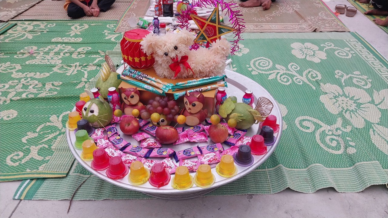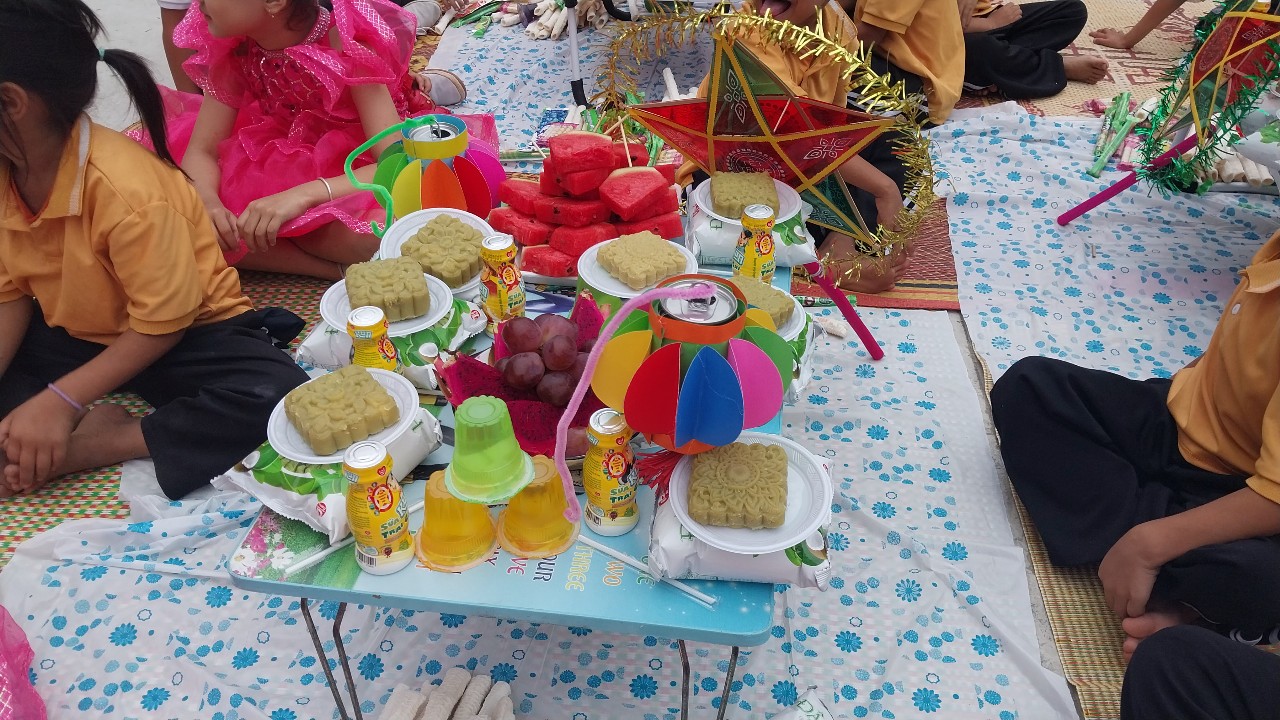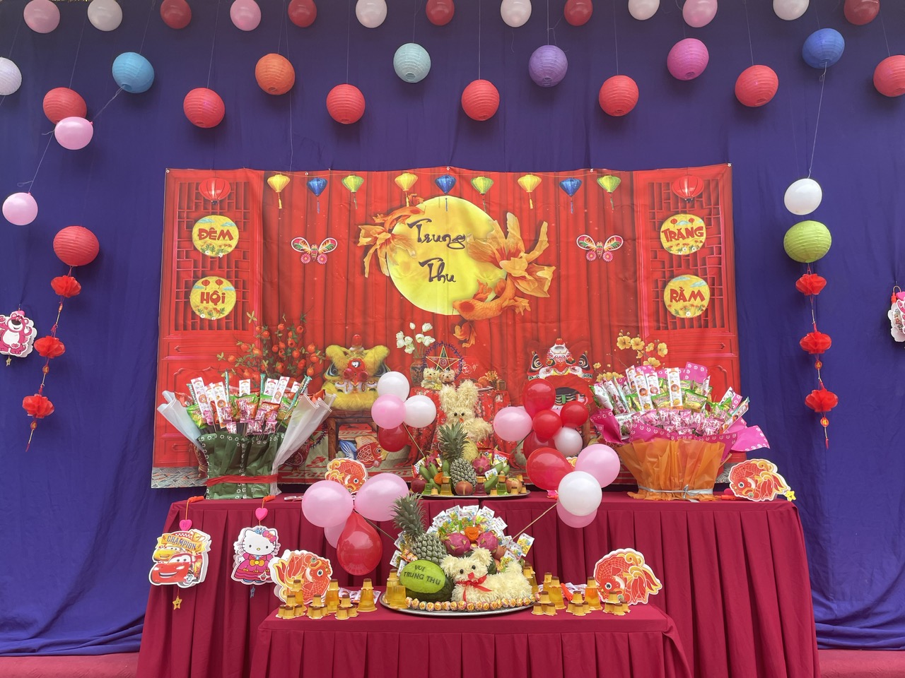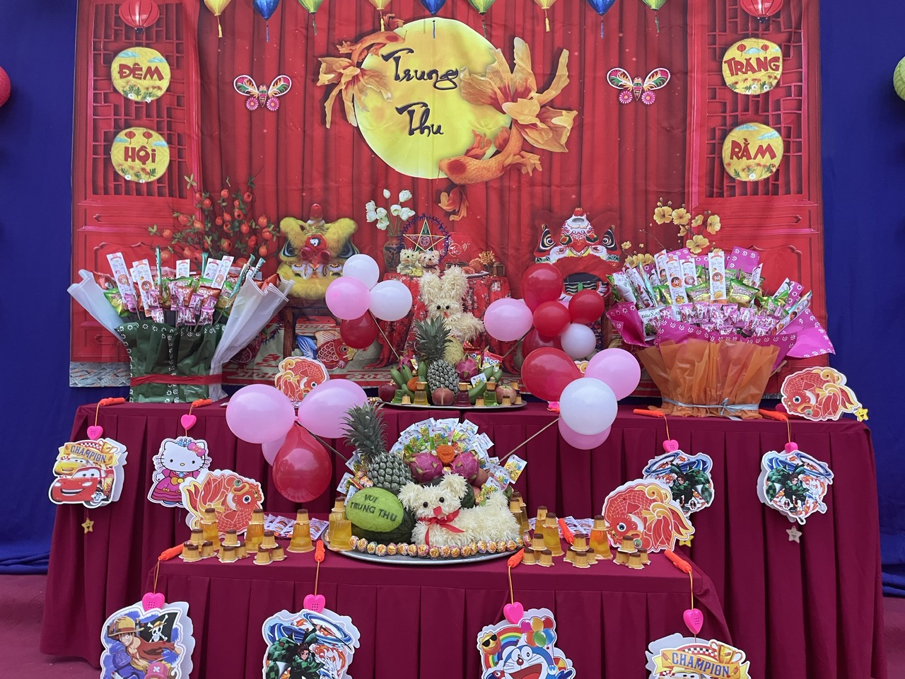 Tiếp nối chương trình, các lớp cùng nhau trưng bày mâm cỗ Trung thu với nhiều loại hoa quả, bánh kẹo được sắp xếp khéo léo, sáng tạo. Mỗi mâm cỗ là một tác phẩm nhỏ chứa đựng thông điệp yêu thương, tinh thần đoàn kết và niềm háo hức đón trăng rằm của tuổi thơ. Những chiếc đèn lồng lung linh đủ sắc màu tỏa sáng khắp sân trường, gợi nhớ về nét đẹp truyền thống của dân tộc.