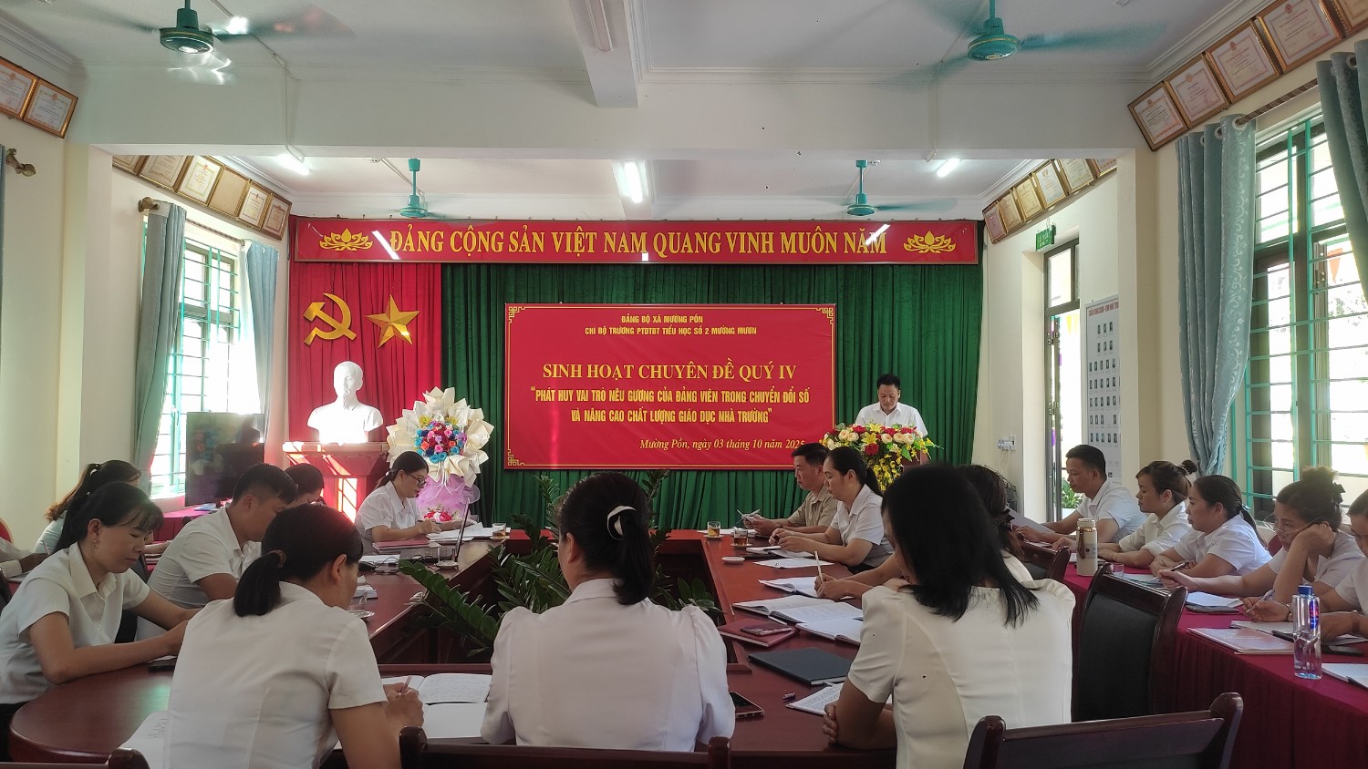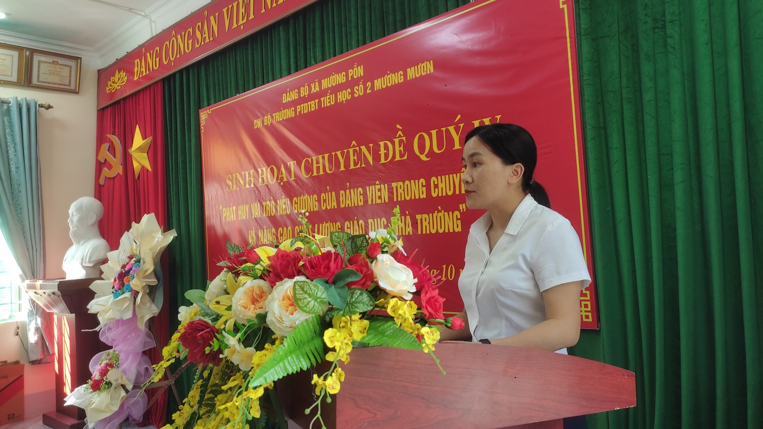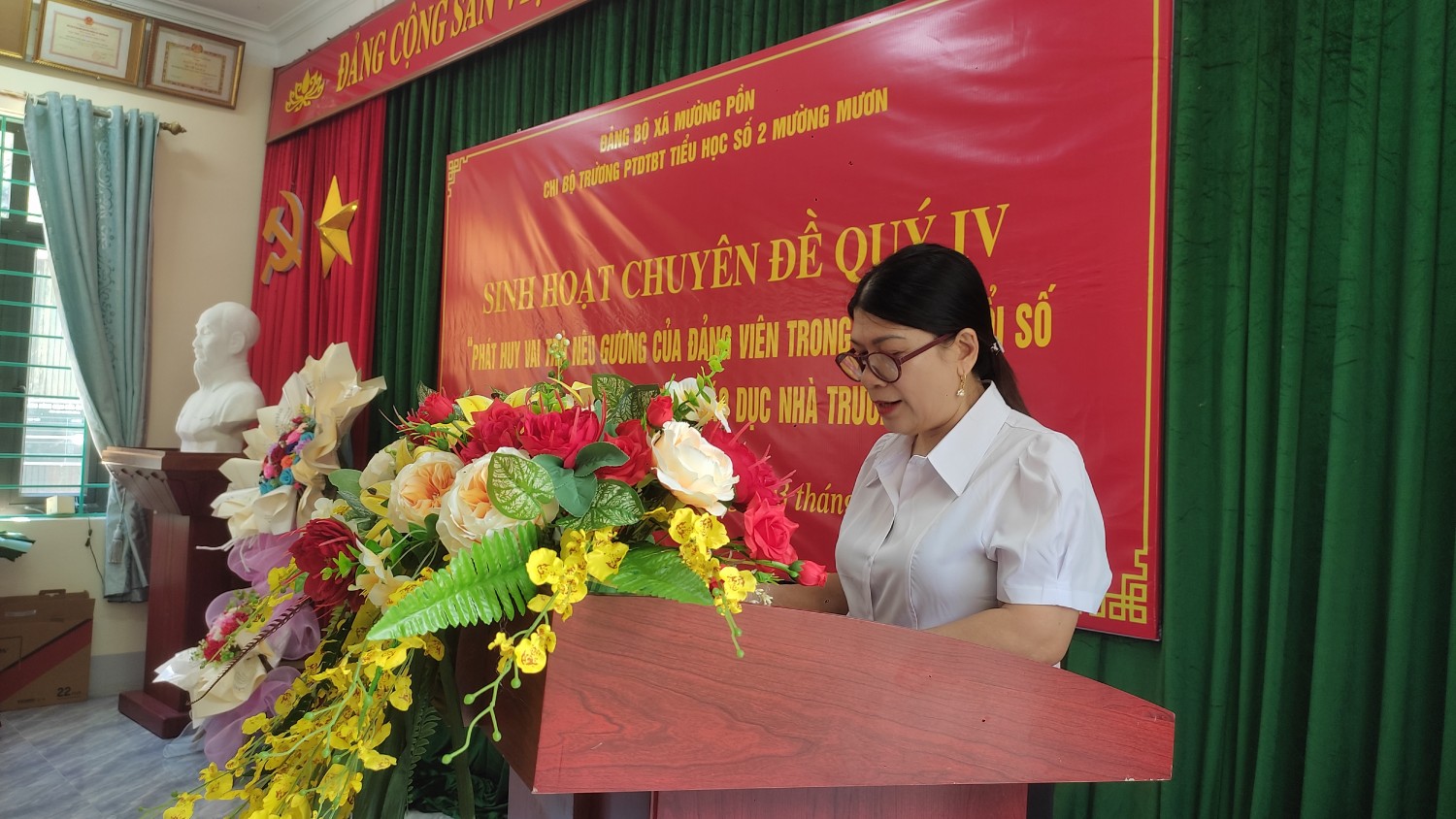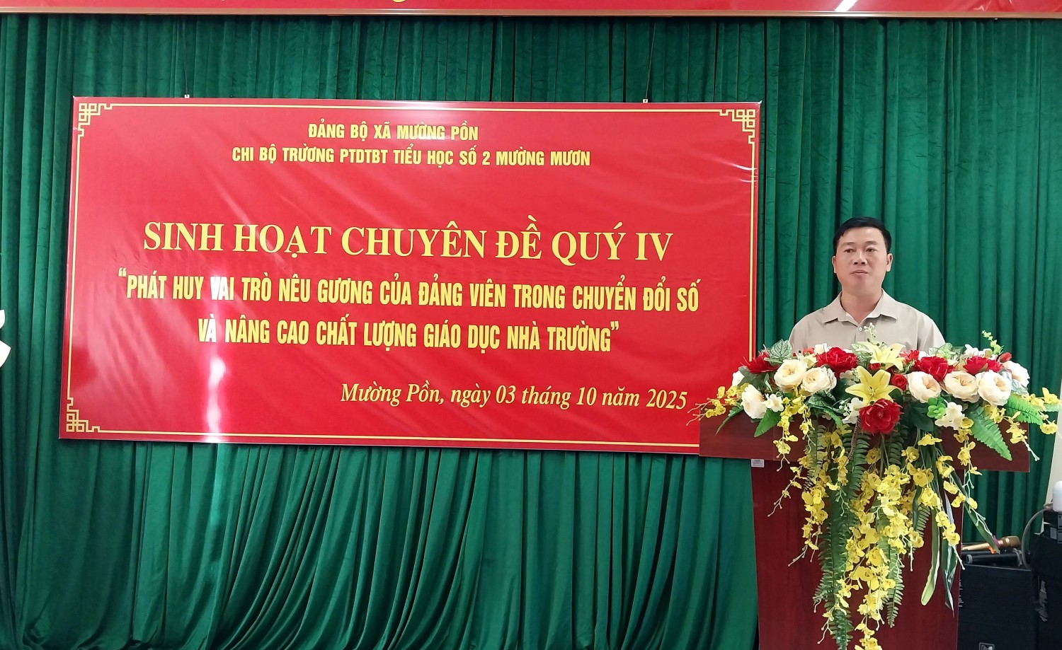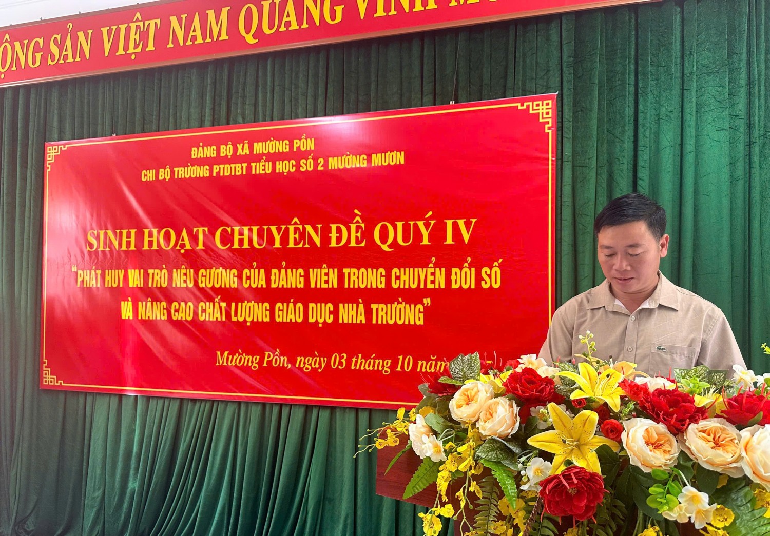 Phát biểu chỉ đạo, đồng chí Lò Văn Huấn ghi nhận tinh thần trách nhiệm, sự chủ động và sáng tạo của Chi bộ Trường PTDTBT Tiểu học số 2 Mường Mươn trong việc lựa chọn và triển khai chuyên đề. Đồng chí nhấn mạnh: mỗi đảng viên cần tiếp tục phát huy vai trò tiên phong, gương mẫu trong mọi hoạt động, nhất là trong công tác chuyển đổi số và nâng cao chất lượng dạy học, từ đó lan tỏa tinh thần trách nhiệm đến toàn thể cán bộ, giáo viên, nhân viên trong nhà trường.