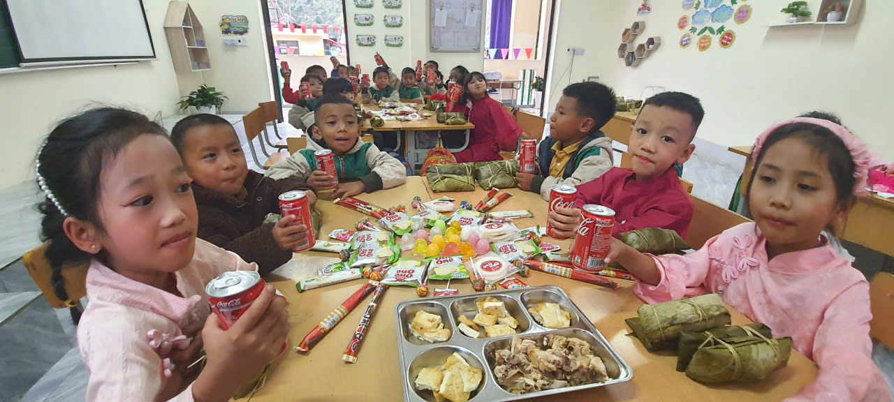Kết thúc hoạt động, thầy cô, phụ huynh và học sinh cùng nhau thưởng thức bánh chưng, kẹo Tết, chia sẻ niềm vui trong không khí ấm áp của mùa xuân mới. Đây không chỉ là giây phút sum vầy ý nghĩa mà còn giúp các em cảm nhận rõ hơn giá trị của sự sẻ chia, yêu thương.